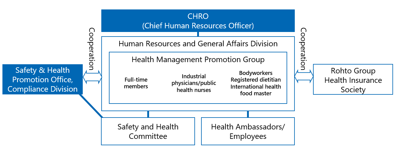 At our company, under the Chief Human Resources Officer(CHRO), the Health Management Promotion Group of the Human Resources and General Affairs Division takes the lead in promoting health and productivity management initiatives in collaboration with the human resources and general affairs department of each base, Health Ambassadors, Safety and Health Committee Members, and Rohto Group Health Insurance Society.