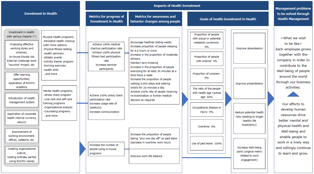 We believe that health is the foundation for realizing personal growth and individual well-being, and we established the Health and Productivity Management Declaration in 2018 with the aim of “working at ROHTO to bring health benefits.”