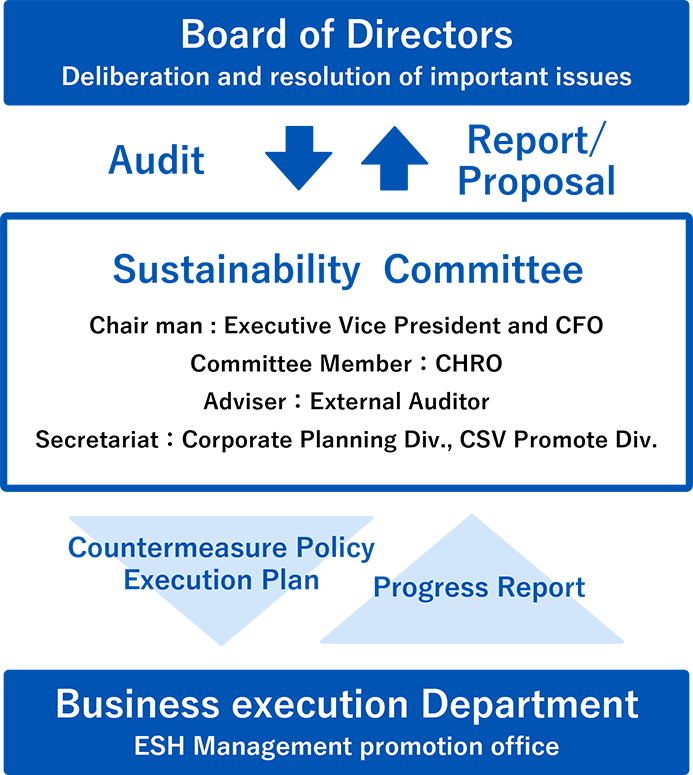 The Sustainability Committee was established in September 2021 as an advisory committee to the Board of Directors to promote sustainability measures. The Committee is chaired by the Executive Vice President (CFO and in charge of ESG), with the Chief Human Resources Officer (CHRO) as a member and an Outside Audit & Supervisory Board member as an observer. The Corporate Planning Department and the Public Relations & Creating Shared Value Division serve as the secretariat for discussions on ESG, SDGs and other sustainability-related issues, policies and measures. The Committee formulates countermeasure policies and action plans for the identified issues, and monitors and evaluates progress. The deliberations of the Committee are reported and suggested to the Board of Directors as appropriate, and particularly important matters are discussed and resolved by the Board of Directors. In addition, we established the ESH Management Promotion Office, a dedicated department for promoting ESG-related initiatives, within the Public Relations & Creating Shared Value Division in a reorganization in March 2022, thereby creating a practical promotion system.