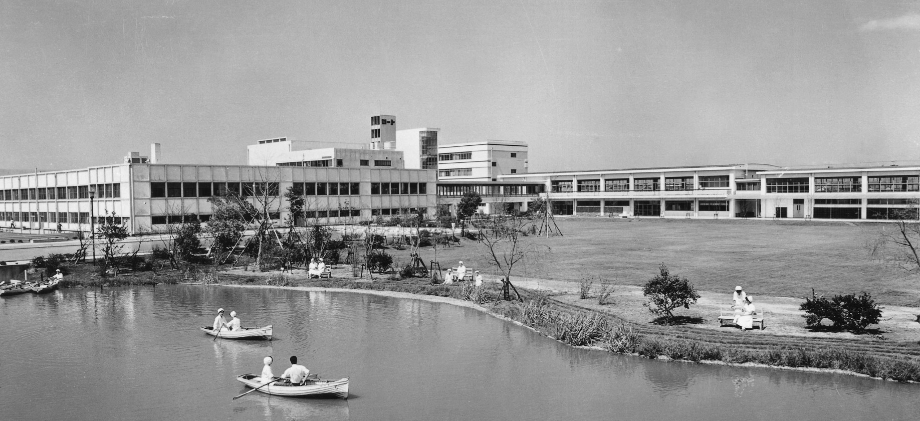 戦後の高度経済成長期において、お客さまの日々の生活でも健康が意識されはじめ、企業としてさらに高い生産能力が求められるようになりました。1959年、「ロートユートピア」として設立された大阪本社は最先端の生産機器を導入したほか、当時としては珍しく冷暖房が完備され、目の前に広がる池ではボートを漕いでくつろいだり、体育館で卓球を楽しんだり、夏場は終業後にプールで泳いだりなど、働きながらも楽しく体を動かす社員の姿が見られるようになりました。