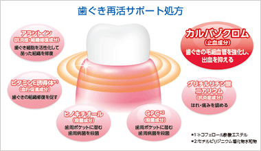 - 歯槽膿漏薬として日本初となる、アラントイン(組織修復成分)とカルバゾクロム(止血成分)の組み合わせを採用しています。
