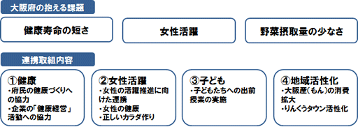 今回、課題解決のための取組として①健康、②女性活躍、③子ども、④地域活性化の4つの軸を挙げました。具体的な連携として、ロート製薬が運営するレストラン「旬穀旬菜」(グランフロント大阪)において、大阪産(もん)を用いたメニューや府が推進しているV.O.S.メニュー※4を開発し提供することをはじめとし、様々な取組を検討してまいります。