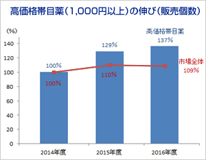 一般用目薬市場は近年増加傾向にあり(2014年度比109%)、中でも販売金額が1,000円以上の高価格帯目薬の伸びが顕著です(2014年度比137%)。
