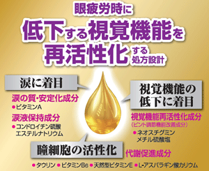 - 視覚機能の低下、涙、瞳細胞の活性化の3方向から、眼疲労時に低下する視覚機能を再活性化する処方を設計しました。