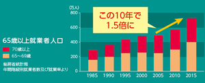 総務省統計局の年間階級別就業者数及び就業率では、2015年には65歳以上の就業者人口が10年前と比較した時の1.5倍にも増えています。