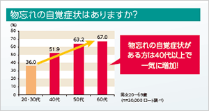 40代以上から物忘れの自覚症状が加速し、50代を超えると6割以上が「このままではいけない、なんとかしたい」と思いつつ、実際には特に何の対処もしていないのが現状です。