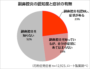 「アレルギー疾患診断治療ガイドライン2007」によると、花粉症などのアレルギー性鼻炎発症者の約4割が副鼻腔炎を併発しているとの報告があり、当社でもアレルギー性鼻炎(花粉症)発症者を対象に調査を行ったところ、23%の人が「副鼻腔炎」の症状があると回答しました。