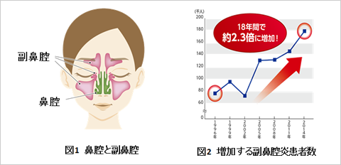 副鼻腔炎になると鼻づまりや息苦しさ、ネバネバ(粘性)鼻みず、頭重などの症状を引き起こします。感冒やインフルエンザ等の細菌やウィルス感染の他、花粉症などのアレルギー性鼻炎に起因する副鼻腔炎も増加しています(図2 平成26年患者調査(傷病分類編)厚生労働省大臣官房統計情報部より引用)。