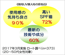 UVカット機能付き乳液市場は、前年比111%※5と大きく伸長していくことが見込まれます。中でも、高機能なUVカット機能付き乳液の投入により市場は拡大していると考えられます。実際、当社調査によりますと、お客様がUVカット機能付き商品を選ぶポイントは、使用感・高いUVカット効果に続き、「最新の技術や成分」でした。