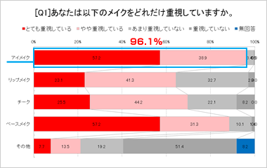 数あるパーツメイクの中で重視する箇所を尋ねてみると、アイメイクを重視する人が最も多く96.1%となりました。
