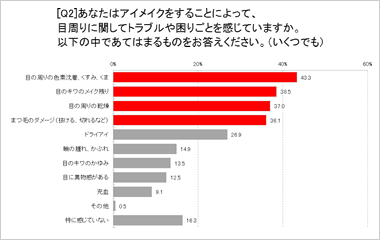 詳しい症状別に見ていくと、目周りの色素沈着・くすみ・くまが一番多く43.3%、目の際のメイク残り(38.5%)、目周りの乾燥(37.0%)、まつ毛が抜ける・切れるなどのダメージ(36.1%)でした。