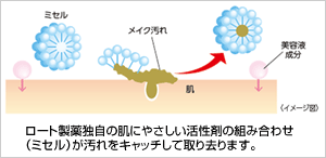 - ロート製薬独自の肌に負担の少ない活性剤の組み合わせ※1で、刺激が少なく、メイクを絡め取るクレンジング効果を実現。