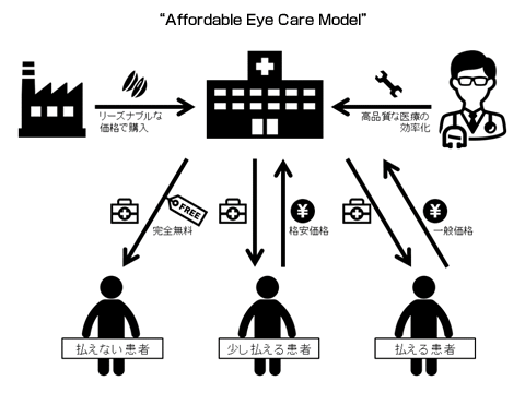 質の高い眼科製品をリーズナブルな価格で仕入れ、高品質の眼科治療をより効率的に提供できる仕組みを導入することで、それぞれの患者に合わせた価格帯(払える患者は一般価格、少し払える患者は格安価格、払えない患者は完全無料)で医療を提供。収益も上げながら、完全無料患者を2割以上受け入れることができるモデル。