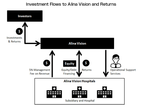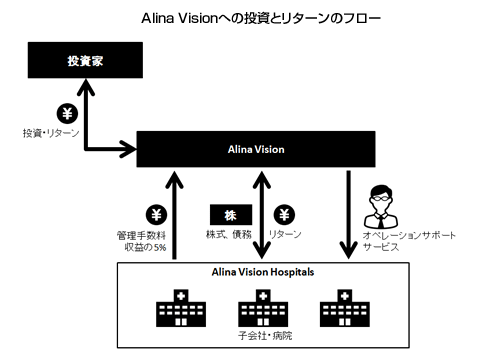 図5.Alina Visionへの投資とリターンの流れとAlina VisionとAlina Vision Hospitalsとの関係