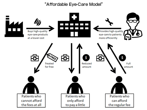 A business model that buys high-quality eye-care products at a lower cost and provides high-quality eye-care to patients more efficiently. It adopts a scaling of payments depending on the patient (patients who can afford the regular fee will pay the full amount; patients who only afford to pay a little will pay a reduced amount; patients who cannot afford the fees at all are treated for free). This allows the service to be able to accept over 20% non-paying patients in total, while also making a profit.