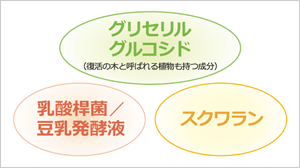 ※3:3種のハリ肌サポート成分:グリセリルグルコシド(復活の木と呼ばれる植物に含まれる成分)、乳酸桿菌/豆乳発酵液、スクワラン