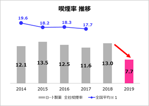 当社は、20年以上前から受動喫煙対策および従業員の卒煙支援に取り組んでおり、事業場内喫煙所の廃止や禁煙外来の全額補助制度など積極的に卒煙支援に取り組んできました。そして、2018年度には「喫煙率ゼロを目指す」という目標を掲げ、さらに全社を挙げて卒煙推進に取り組んだ結果、2019年4月現在の喫煙率は7.7%(女性4.9%、男性11.2%)へと激減しています。引き続き2020年喫煙ゼロの実現に向けて、全社を挙げて卒煙推進に取り組んでまいります。
