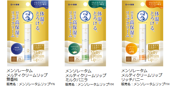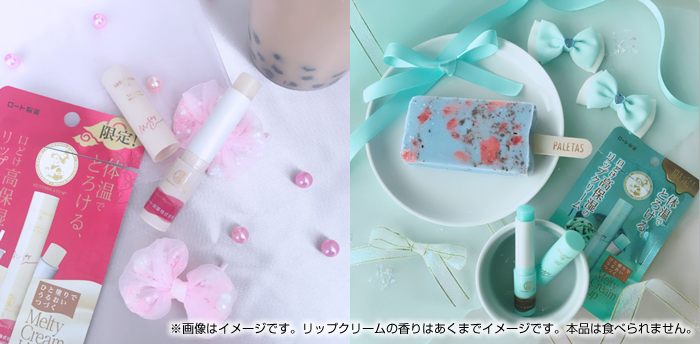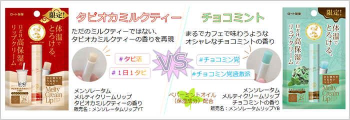 製品・事業 あなたはどっち派?! とろける塗り心地の「メルティクリームリップ」から 「タピオカミルクティー」「チョコミント」の限定フレーバーが登場! 2019年7月16日 ロート製薬株式会社(本社:大阪市、社長:杉本雅史)は、とろける塗り心地と保湿力で人気のリップクリーム「メルティクリームリップ」シリーズから、2つの限定フレーバー「タピオカミルクティー」「チョコミント」を2019年7月23日(火)より全国の薬局・薬店で限定発売いたします。とろける塗り心地と保湿感を感じながら、人気の2つのフレーバーをお楽しみいただけます。また、昨年の限定フレーバーとして大人気だった「抹茶」がレギュラーフレーバーに仲間入り。抹茶由来エキス※1配合で、抹茶の香りに癒されながらくちびるを潤わせます。 ※1:保湿成分(チャ葉エキス) メルティクリームリップについて とろける塗り心地にやみつきになる女子続出♡メンソレータムの高保湿王道リップクリーム 「メルティクリームリップ」シリーズは、唇から失われる潤いを閉じ込めるだけでなく、外気や呼気中の水分まで取り込んで潤い続ける『モイストバンク技術』を搭載した保湿リップシリーズです。まるでクリームがとろけるようなこれまでにない、やわらかな塗り心地が人気のシリーズで、保湿感・塗り心地ともに高い評価をいただいています。 商品概要 商品名 メンソレータム メルティクリームリップ タピオカミルクティー(限定発売) メンソレータム メルティクリームリップ チョコミント(限定発売) メンソレータム メルティクリームリップ 抹茶 商品画像 販売名 メンソレータムリップYT メンソレータムリップYB メンソレータムリップYC 特長 タピオカの甘さと、茶葉のふんわりと濃い香りを表現 ミルクティ色の製剤 (※くちびるに色はつきません) 甘すぎないチョコレートの中に、爽やかに広がるミントの香りを表現 ミント色の製剤 (※くちびるに色はつきません) 抹茶の濃厚な香りを表現 抹茶色の製剤 (※くちびるに色はつきません) カテゴリー 化粧品 容量/価格 2.4g/オープン価格 参考資料『ロート製薬のリップクリームの歴史』 年 商品名・容量・価格(税抜) 特長等 1975年 メンソレータム薬用リップスティック 4.7g 300円 ロート初のリップスティック。同年、「メンソレータム」の日本での商標専用使用権を取得し、販売開始しました。(当時は輸入販売)日本で初めてリップクリームのTVCMを実施し、大きくシェアを取った結果、リップの定番=「メンソレータム」に。 唇は皮膚の中でも特に薄く、荒れやすいため、リップで保護し、美しく健康な唇を保つためのアイテムとして定着しました。 1979年 メンソレータム薬用キャンパスリップ 4.5g 430円 女子中高生向けに、彼女達が憧れる「大学のキャンパス」をイメージさせるネーミングのリップを発売。唇につけるリップスティックに靴のイラストをあしらう事は当時大人には抵抗感がありましたが、女子中高生には「靴のデザインが一番可愛い」と圧倒的な支持を受けました。5種類の香りをつけて発売したところ、人気の香りは品切れになるほど大ヒットしました。 1983年 薬用キャンパスリップほそみ 2.3g 480円 おしゃれリップの定番になった商品。女子中高生の胸ポケットに入るように、リップを細くしました。細いリップは製造過程で折れやすく、製剤が固いと折れないものの塗心地が悪い。細く・折れず・塗りやすい処方開発にかなり苦労を重ねました。 細くスタイリッシュな容器、使いやすさにこだわった「ほそみ」は女子中高生に爆発的な人気となり、リップ=「おしゃれなアイテム」というスタイルが定着しました。 1987年 メンソレータム薬用リップオンリップ 8g 500円 日本初のジェリー状リップ。当時、「口紅は唇が荒れるので、先にリップを塗ってから使う」という女性の意見を元に、「口紅の下地に使うリップジェリー」という新しい使用方法を打ち出し、大ヒットしました。これにより、「口紅の下にリップを塗る行為」を定着化させました。処方は低刺激のワセリンを組み合わせ、ドーム状の先から少量出て、唇の温度でさらりと溶けるような固さの処方を開発。開発までには100以上の処方を検討しました。 1998年 メンソレータムメディカルリップ 8.5g 980円 医薬品のリップクリームを発売。口角炎、口唇炎等を治療します。 1998年 メンソレータム薬用ソフトリップス 4.5g 350円 すべるようになじむ新感覚の塗り心地の、「ノンメントールタイプ」の薬用リップクリーム。さわやかなハーブブレンド(セージとカモミール)の香りをつけました。この「ソフトリップス」はその後、海外展開も広がり、特にアメリカでは主力商品となりました。現在では中国、ベトナム、台湾、マレーシアのリップクリーム市場でトップシェアとなっています。 2000年 メンソレータム薬用リップベビー 4.5g 450円 「敏感な唇の方や赤ちゃんにも毎日安心してお使いいただけるものを」と開発した、無添加リップです。 2001年