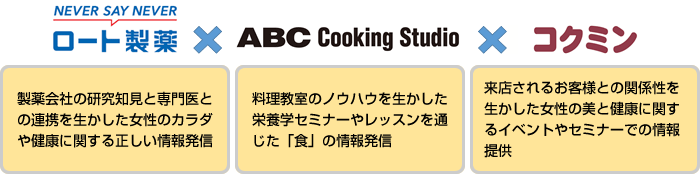ロート製薬株式会社(本社:大阪府大阪市、代表取締役社長:杉本雅史)、株式会社ABC Cooking Studio(本社:東京都千代田区、代表取締役CEO:横井啓之)、株式会社コクミン(本社:大阪府大阪市、代表取締役社長:絹巻秀展)の3社は、2019年7月21日(日)、将来妊娠を望むうえでも大切なカラダづくりのための正しい知識や食生活について地域に根差した情報発信を行うことを目的とした3社共同プロジェクトを発足いたしました。