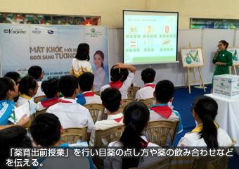 ベトナム進出当初、「目薬は、目に疾患がある時に利用するもの」というイメージが強く、普段使いする習慣はありませんでした。そこで学校にて無料眼科検診を実施するなど、目の大切さを訴える啓発活動を実施しながら、疲れ目に目薬を点すという新習慣を広めています。2006年からは、お客様の声を直接聞く「カスタマーギャザリング」を毎週末に実施し、現在も継続。活動内容は、新しい製品開発に活かされています。