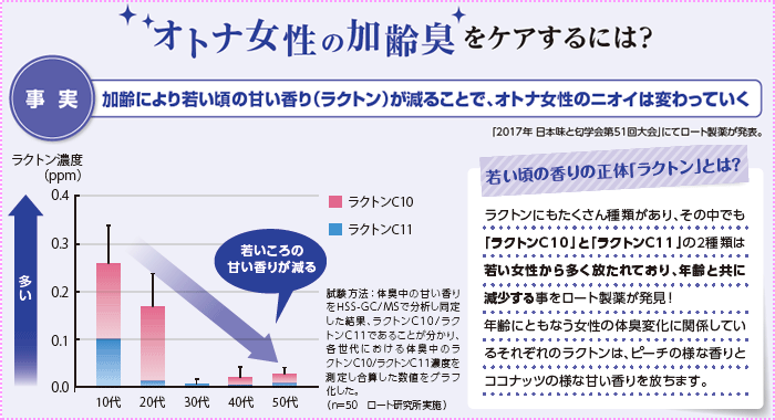 - 「ラクトン」を含むスウィートフローラルの香り…年齢とともに減少する甘い香りを補い、女性らしい香りをまといます。