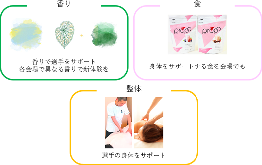 eスポーツ選手のヘルスケアを支援する観点でも協業してきている両社の強みを活かし、①香り、②食、③身体ケア(整体・リラクゼーション)をご用意することで、参加する選手もご覧いただくお客様にも楽しんでいただける環境をご提供します。またご来場いただいた方にも、その一部を体感いただきます。