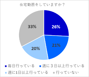 在宅勤務ができる環境下の方の中で、在宅勤務をしている人は、67%にのぼりました。毎日行っている方26%、週に3日以上行っている方は21%となり、およそ半数の方はオフィスに出勤する日よりも在宅勤務の方が多い働き方となっております。
