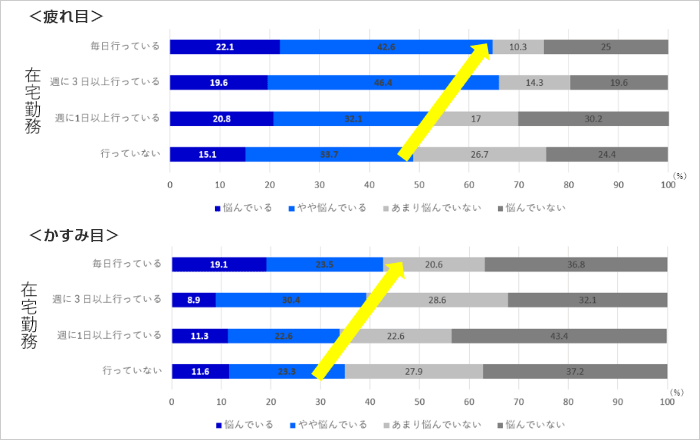 在宅勤務の頻度が高い人ほど、目の症状で悩んでいる人が増加