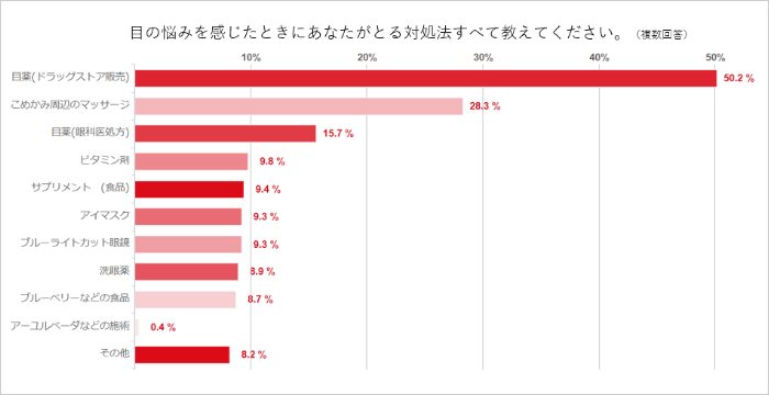 目の悩みを感じた際の対処として、「目薬」という回答が最多となりました。