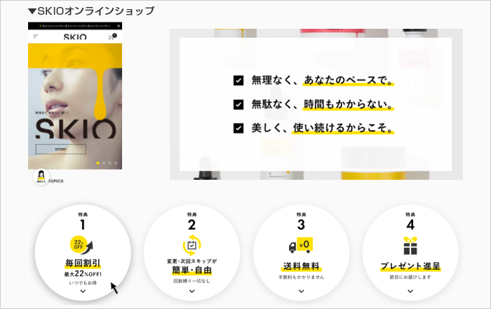 SKIOは、化粧品を選び購入から捨てることまで、全てがスキンケア体験であると捉えています。SKIOオンラインショップでは、「無理なく、無駄のない」スキンケア体験として、商品認知から購入までが統一されたブランド世界観の中で行えること、お客様の購入全般に関する質問にAIが回答するチャットボットを導入したことによる「買いやすさ」、リピート割引や定期購入の自由な設定が行える「継続購入のしやすさ」を提供しております。