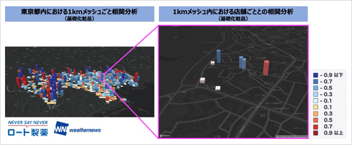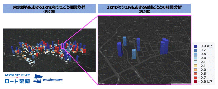 今回の実証研究では、ウェザーニューズ提供する1kmメッシュの高解像度過去気象データ(気温・降水量・天気・湿度・気圧・風速・風向・日射量)及び独自の体感指数と、ロート製薬の3商品(①基礎化粧品、②皮膚薬、③漢方薬)の店舗ごとの出荷データを掛け合わせ、気象条件が購買に及ぼす影響を分析しました。