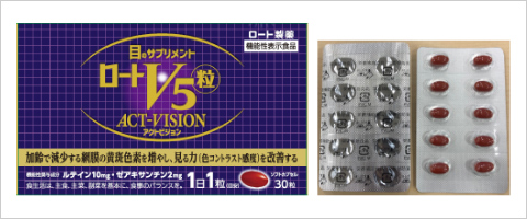 こうした「ロートV5粒」のご好評を受け、服用後の跡を確認できるPTP包装(シートタイプ)に進化した、サプリメント「ロートV5粒アクトビジョン」の発売に至りました。加齢と共に減少する網膜の黄斑色素を増やし、見る力(色コントラスト感度)を改善いたします。