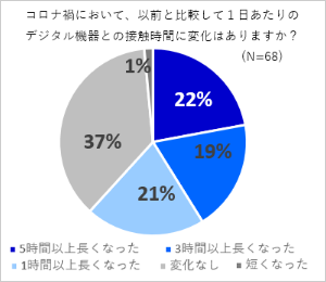 毎日在宅勤務をしている人では、5時間以上長くなった方が22%、3時間以上長くなった方が19%、1時間以上長くなった方が21%となり、合計すると62%の方がデジタル機器接触時間が長くなったという結果になりました。