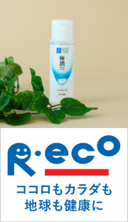 ロート製薬では2004年の発売以降、世代を越えたくさんのお客様にご支持いただくブランドの「肌ラボ」において、2005年には当時ではあまりなかったガラス瓶からプラスチックボトルへ容器の仕様を変更、詰め替え用パウチを発売しました。詰め替え用パウチは「容器よりもリーズナブルでゴミを減らすことができる」とお客様からご好評の声をいただき、現在では常識となった市場を創出しました。さらに現在では「肌ラボ」ブランドの多くの商品に植物由来の原料を一部に用いたバイオマス容器に仕様を変更、その他日焼け止めの「スキンアクア」シリーズの一部商品にてパッケージにメカニカルリサイクルPETフィルムを一部に使用しており、これら環境に配慮した商品には独自の環境マーク「R・eco」マークを導入しています。多くのお客様にご使用いただくからこそ、地球環境も考え、商品を展開しています。