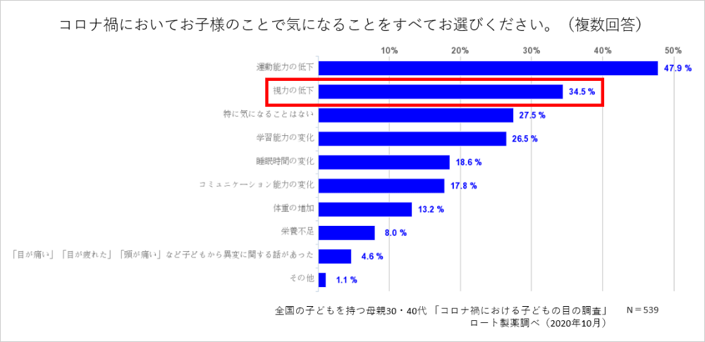 コロナ禍においてお子様について気になることを伺ったところ、「運動能力の低下(47.9%)」、「視力の低下(34.5%)」と続き、約3人に一人は子どもの視力の低下を気にしていることが分かりました。