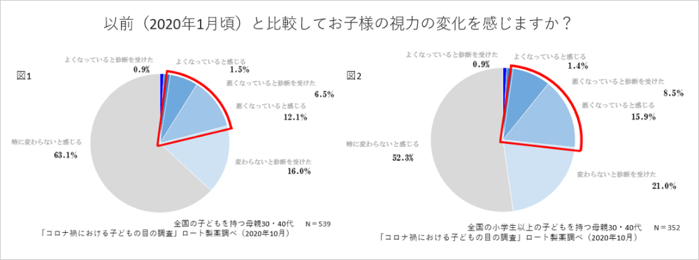 新型コロナウイルス感染症の流行前、2020年1月頃と比較し、約5人に一人(18.6%)は視力が悪くなっていると診断を受けたり、感じると回答しました(図1)。さらに小学生以上の子どもを持つ方では約4人に一人(24.4%)が視力が悪くなっていると診断を受けたり、感じると回答しました(図2)。