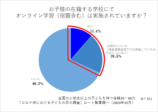 現在、オンライン学習をしている子どもは約11%。すでに約3人に一人が経験済み