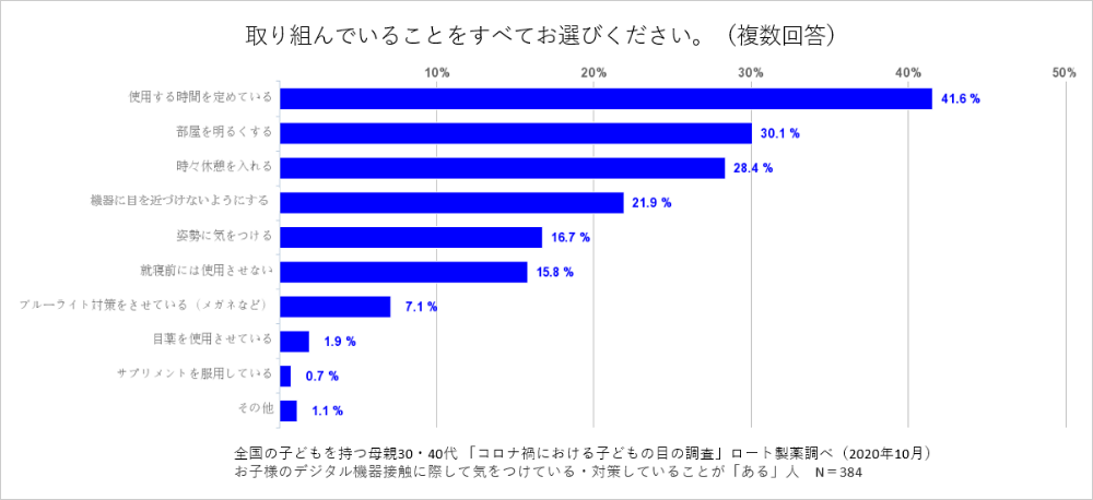 お子様のデジタル機器接触において、気をつけている・対策をしていると回答した方は63.6%となりました。具体的な取り組みを聞いたところ、「使用する時間を定めている(41.6%)」、「部屋を明るくする(30.1%)」、「時々休憩を入れる(28.4%)」が上位となりました。目薬やサプリメントなどでケアする前にまずは各家庭の日常生活のなかで対策をしていると考えることができます。