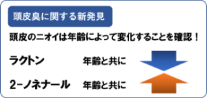 また、年代別の頭皮臭について研究を行ったところ、頭皮のニオイのターニングポイントは30代であることが明らかとなりました。若いころの甘い香り「ラクトン」が30代以降で低下し、加齢臭の一つである「2-ノネナール」が30代以降で増加傾向にあることを確認しております。