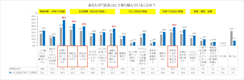 妊活意識を高くもつ「ふたり妊活できている」男性は、夫婦で家族設計についてきちんと話し合ったり、身体を整えたり、排卵日にあわせて夫婦生活を行うなど、女性と協力して、積極的に妊活を進めていることがわかります。