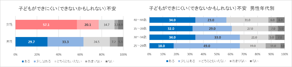 なんと63%の既婚男性が、将来子どもができにくい(できないかもしれない)体質だという不安を抱えていることがわかりました。77%を超える女性と比較すると少なくはなりますが、どの年代においても不安を感じていることがうかがえます。