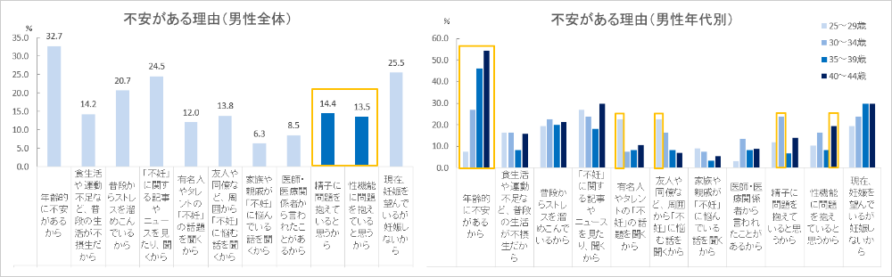 体質不安の要因を詳しく聞くと、周囲の知人や芸能人のニュースなどで不妊の情報が入ってくる中、結婚・出産年齢の高まりは男性にも不安を与えていることがわかりました。年齢や不妊のニュースだけでなく「精子」や「性機能」への不安を抱えてること人も多いようです。特に、30歳以上の既婚男性の5人に1人は精子に問題があるかもしれないと感じています。不安を解消する手立てが求められます。