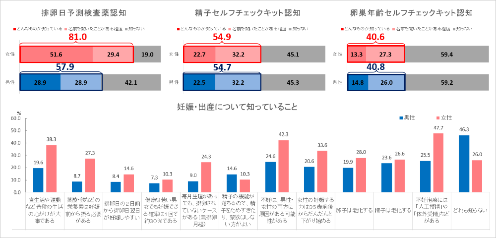昨今話題にのぼることも多い、精子のセルフチェック。名前を聞いたことがある人は男女ともに50%を超えていることがわかりました。排卵日予測検査薬に比べると低くはありますが、セルフ妊活への関心度がうかがえます。でも、まだ使用率は低く、3.8%にとどまっています(前出グラフ参照)。男性の妊活意識の向上が、次には行動変化につながっていくことが期待されます。妊娠・出産についての知識の男女差もまだありますが、「ふたり妊活」の高まりで埋まっていくと予想されます。