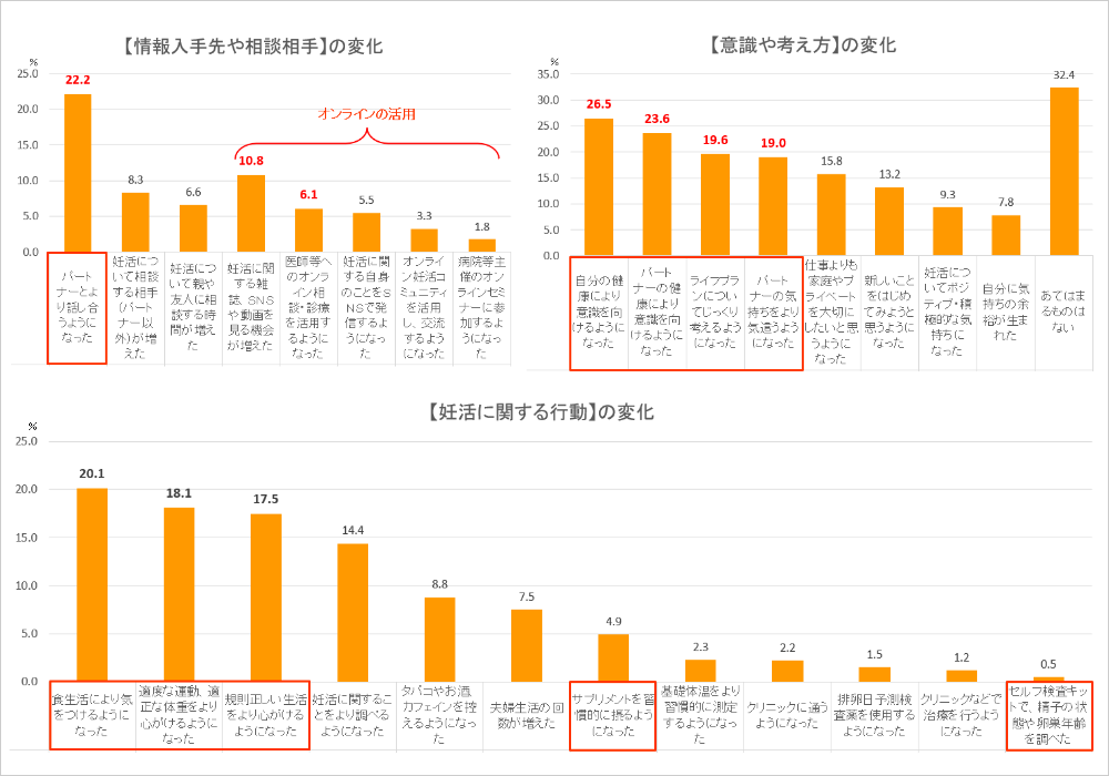 新型コロナウイルスの影響で、約半数の男性が「それ以前と比べて情報入手先や相談相手が変化した」と答えました。特にパートナーとより話し合うようになるなど、ふたり妊活の推進につながったようです。オンラインによる診療や妊活情報の収集など、今できる取り組みを模索している様子もうかがえました。また、自分のライフプランや家族のことをより考える時間が増え、健康やパートナーの気持ちを気遣うようになるなどの意識変化も見られました。新たにサプリメントやセルフ検査キットの使用を始めるなど、積極的な活動をスタートした方も少数ながらいるようです。