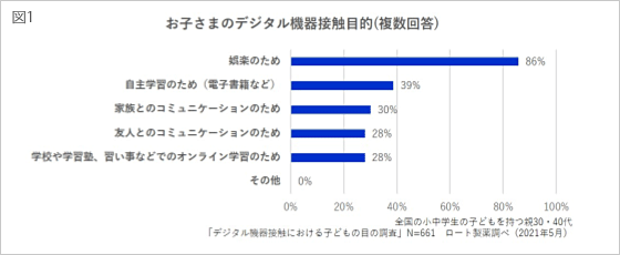 お子さまのデジタル機器接触目的は、「娯楽のため」と回答した方が86%となりました。その他「自主学習のため(39%)」、「家族とのコミュニケーションのため(30%)」が続きました。(図1)