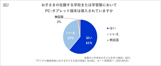お子さまの在籍する学校または学習塾でのパソコン・タブレット端末の導入状況について伺ったところ、61%の方が「導入されている」と回答しました。(図2)