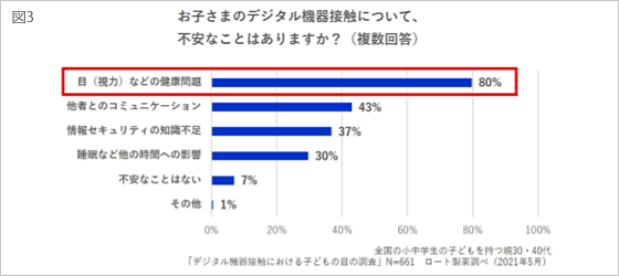 デジタル機器接触における不安 第1位は「目(視力)などの健康問題」80%