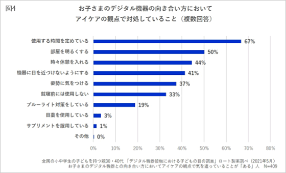 約6割がアイケアの観点で対処を行っているが、対処しない方の理由の半数は「方法が分からない」から