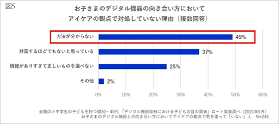 お子様のアイケアの観点でデジタル機器との向き合い方に気を遣っているかを伺ったところ、「気を遣っている」と回答した人は61.7%となりました。具体的な対処方法として、「使用する時間を定めている(66%)」、「部屋を明るくする(50%)」、「時々休憩を入れる(44%)」といった回答が続きました。(図4)また「気を遣っていない」と回答した人の理由として、「方法が分からない(49%)」と回答した人が一番多く、半数近くにのぼりました。(図5)