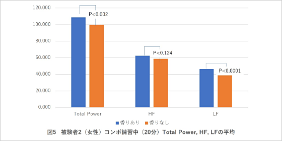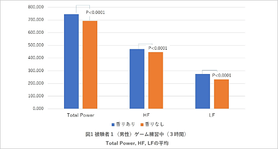 練習後の安静時にTotal Power(LFとHFの総和)が明瞭に増加しました。練習中と練習後で比較した数値をコントラスト値で算出した場合、香りを使用した方がコントラスト値は高く、ゲームによるデジタル疲労の回復率が香りのない時と比べて約4倍であったことが示唆されます。